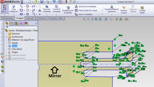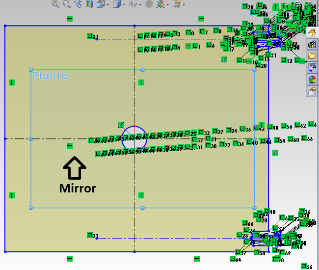 One of the features of Solidworks is that it allows to create parts and then assemblies. We open solidworks and choose create part, to begin the design you must choose the work area, I always choose En mi caso "plan view", Because my design is symetrical, I must finish one side and then by mirror the next sketch is done. For that purpose auxiliary lines are indicated to make the symetry. First respect the joint Then a line in the middle of the sketch generating symetry, then a 10mm circle is drawn acording to the coordinates axis