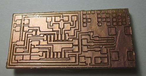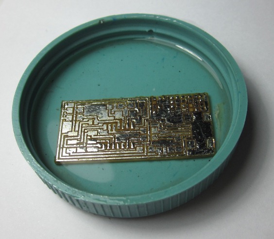 This process requires high accuracy becuse the components and their joints are too little, so a tin coat is done in every joint aplying an extra coat with flux and this result is reached (image 2), Then the plaque is inmersed in alcohol to remove al the flux(image 3), this is noticed whes a yellow tone appears, carefull with the orientation of the diodes (anode and cathode), check the joint of the source from Attiny marked with a circle in the corner. The last step is to chek if the FABISP works, with the AVR programmer, if the led is green all is right.