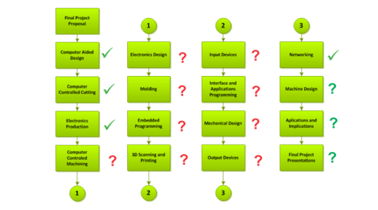 Thats my working plan. The checks mean that those are assignments that I think I can make. The X means assignments that I will learn during the course. For me, the most difficult part is the electronics part, which might take a lot of time for me to understand
