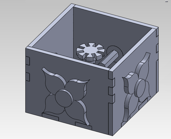 I like to design products, rings (jewelry), boxes, and this time I propose to build a box, but not any box. It will be a personalized variation of the Pandora box that in order to be opened, it will have four mechanisms with the shape of a flower on each side. to open this mechanisms, the images in each one of the sides must match. When it happens, the box will be opened and another mechanism form inside will go up. It has the shape of a flower (like a cocoon) that will open and will show you its content