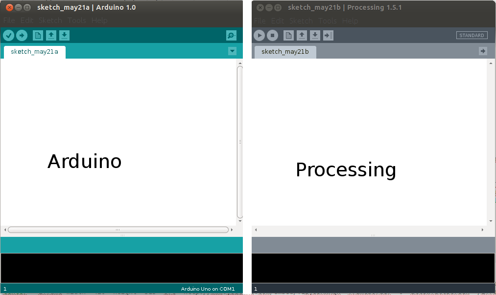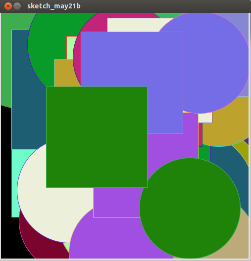 * Phototransistor Input to Circle * * Read data from the serial port and changes the fill and stroke color of a circle * relative to the values recieved from the sensor. * Circle fill and stroke are random, unless a sensor value below 200 is recived. */ //import serial library import processing.serial.*; Serial serialPort; // Create object from Serial class int diameter= 500; // initial diameter of the circle void setup() { size(500, 500); stroke(255); smooth(); // I know that the first port in the serial list on my mac // is always my FTDI adaptor, so I open Serial.list()[0]. // On Windows machines, this generally opens COM1. // Open whatever port is the one you're using. println(Serial.list()); serialPort = new Serial(this, Serial.list()[0], 9600); } void draw() { //filter out the 1,2,3,4 framing code numbers while (serialPort.available () > 4) { int lightIn = serialPort.read(); //if the sensor value is greater than 200 //(you may need to tweak this number to get the code to respond to your board) if (lightIn > 200) { //print in the sensor values to the console println(lightIn); //set the variable diameter to the sensor value diameter = lightIn; //use the sensor value to draw an ellipse ellipse(random(500), random(500), diameter, diameter); rect(random(500), random(500), diameter, diameter); //redraw the screen redraw(); } } //EXPERIMENT WITH THE VISUALIZATION BELOW //if the sensor values are less that 200, the elipse with random stroke and fill colors stroke((int)random(255), (int)random(255), (int)random(255)); fill((int)random(255), (int)random(255), (int)random(255)); } The final result is the following image an video: