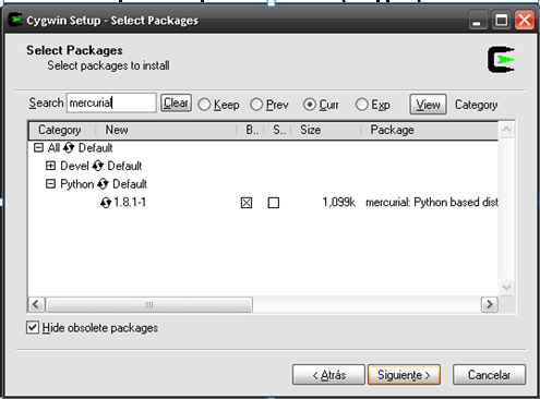 Step 1:Install Cygwin from here execute the setup.exe then click on "next" button Choose "Install from Internet" Then click on "Next" button Choose the directory where you want to run the cygwin (default in "c:\cygwin" then click on "Next" button Choose your internet connection type (direct connection) then click on "Next" button. Choose a download site (you can choose anyone) then click on "Next" button Now you have to select the necessary packages to do the clone with Hg, then click on "Next" button Now in the package list, without clicking in "Next" button, write in search mercurial, open python branch and click in skip, obtaining the image so continuosly we write in search "openssh" without quotes, open Net Branch and click in skip Now install Text Editor "nano", click in Editor default and click in skip. Now yes click en "Next", appears a "Resolving the dependencies" menu, then "Next" until finish the process