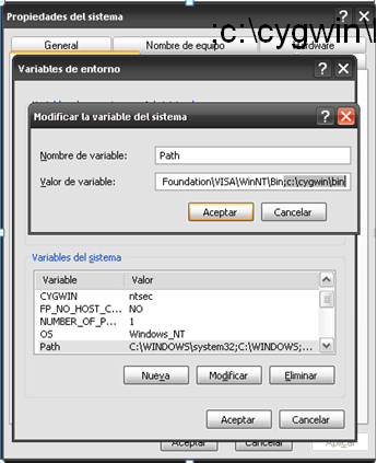 Step 2:SSH Configuration Go to "Propierties", este menú se encuentra en "Inicio" ---- "Equipo" click derecho "Properties" Go to "Advanced" Click on "Envirorment Variables" button, then click "New" button Write in variable name "CYGWIN", write in variable value: "ntsec", then click on "ok" button Scroll and look for "Path" variable, after find it add at the end ";c:\cygwin\bin" then click on "ok" button  That´s the end of SSH configuration, again click on "ok" button