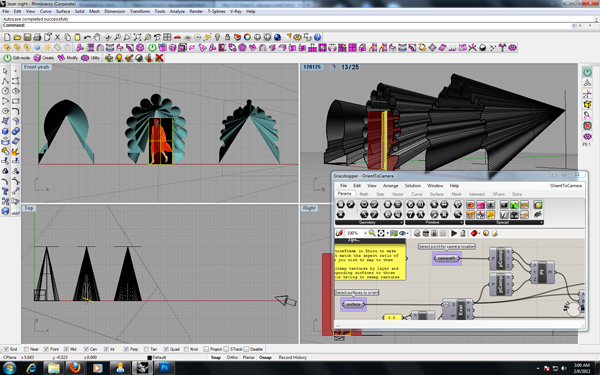 A simple Grasshopper script, 'OrientToCamera', was used to make bitmap billboard plane (lady) face camera wherever it moves.