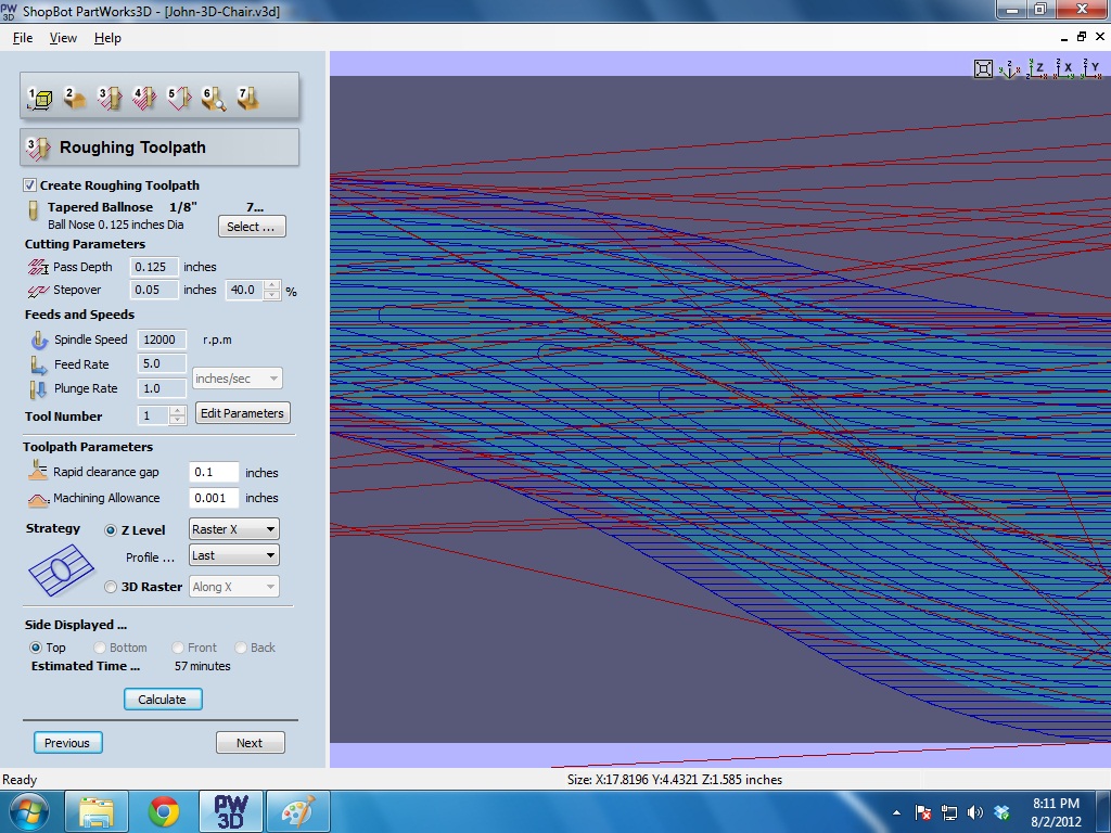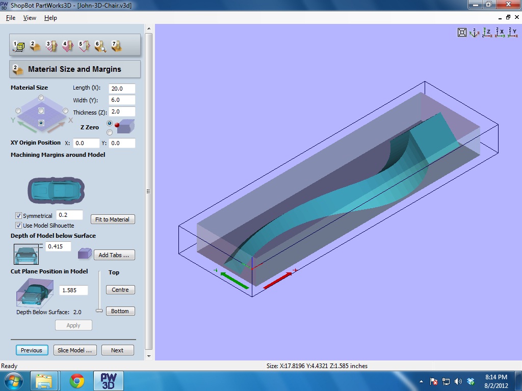 Found a chair in the Sketchup 3D warehouse and extracted this half chair leg. The idea is to make 2 (mirrored) halves and pin/join them together (could try cutting one in a thick enough piece, then flipping it for the mirror so it could cut from 1 solid piece). Exported as a .stl and opened in PartWorks, then chose from preconfigured orientations and laid the chair leg flat. Since the model height is below the material height (pink insulation foam), 'Depth of Model Below Surface' was lowered to .415", and 'Cut Plane' adjusted to height of model - 1.585".