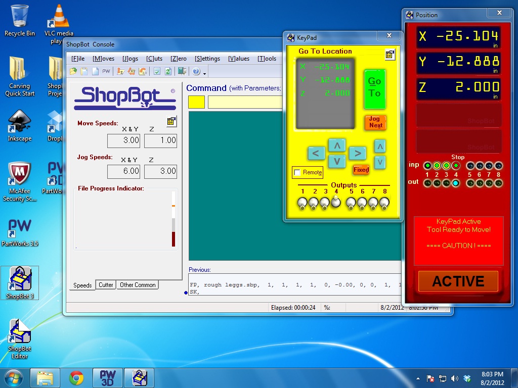 Opened up the ShopBot Console/.sbp file made in PartWorks. Machine needs to be turned on (breaker, machine on, and spindle on (using key) and x, y, and z need to be zeroed/homed. Typing 'K' open up the keypad which is use to direct/orient the spindle.