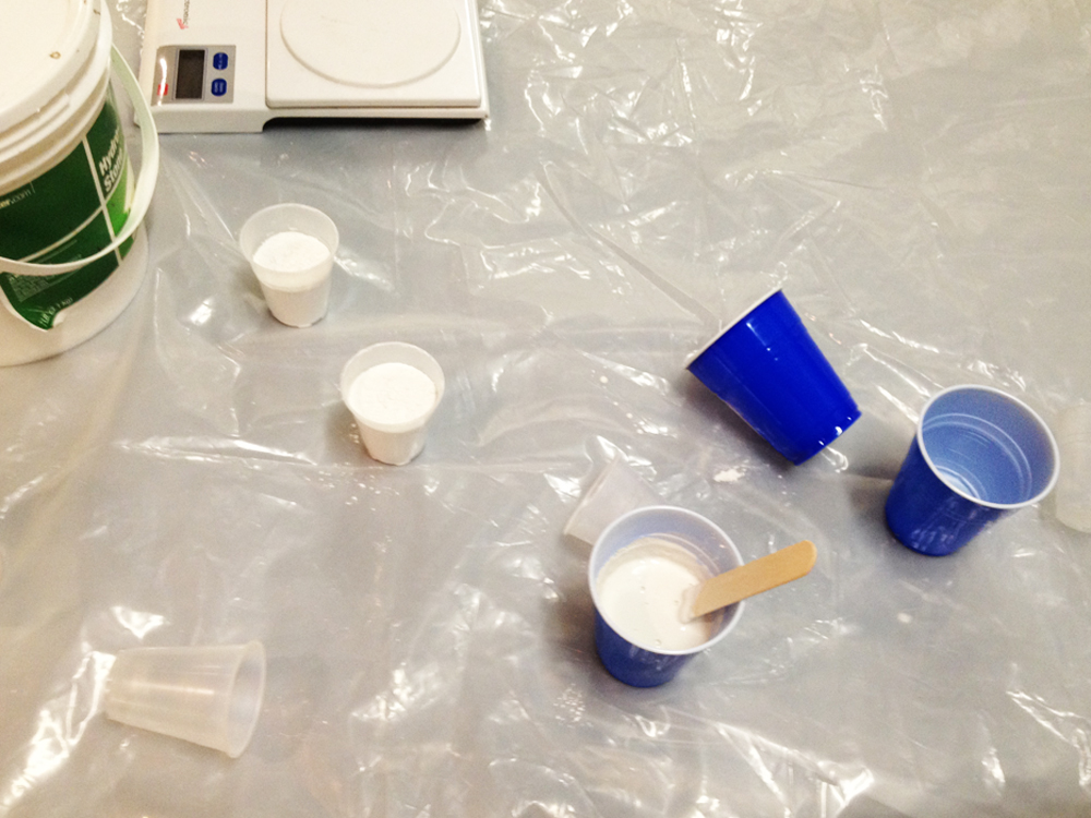 Mix was close to 2 parts Hydrostone per 1 part water. Little cups of Hydrostone were mixed in slowly one at a time - mixing took about 15 minutes, or until the plaster reached the consistency of Bisquick.