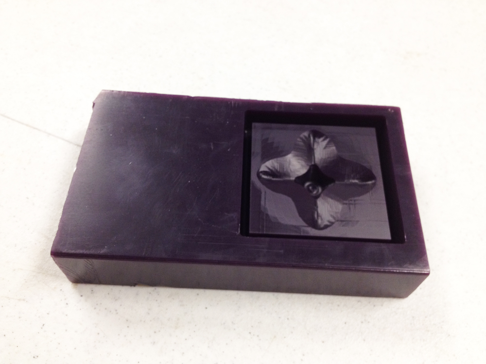 Milling took forever - tool routing often appeared redundant and/or made many unproductive trips back and forth. However, no major problems. Surface finish was a little disappointing - smoothness of Rhino NURBS surface lost in conversion to .stl? I Need to take another look at the export settings.