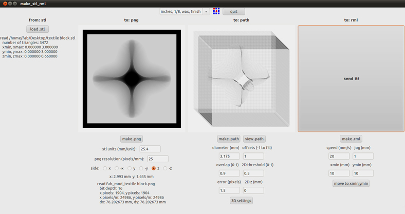 Tile constructed in Rhino and exported as .stl - .stl made into a .png gradient image (raster) from which tool paths were generated. Bottom height did not come in automatically - model bottom height was measured (-16.764 mm). I used the 1/8" round bit for milling. Tool path was not super efficient - I am interested in learning more about programming tool paths to better use time on the machine.