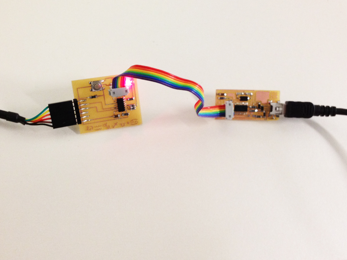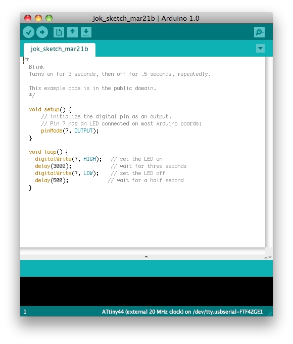 I programmed the board using the Arduino IDE. I opened the Button sketch from the examples menu and changed the pin assignments to match the pins on the "Hello Button" board. I changed the LED pin from pin 13 to pin 7, then selected the USBtinyISP programmer from the tools menu and uploaded the 'Blink' sketch to my board. I changed the code so the LED would stay on for 3 seconds (3000 milliseconds), off for 1/2 second (500 milliseconds), continuing that way forever.