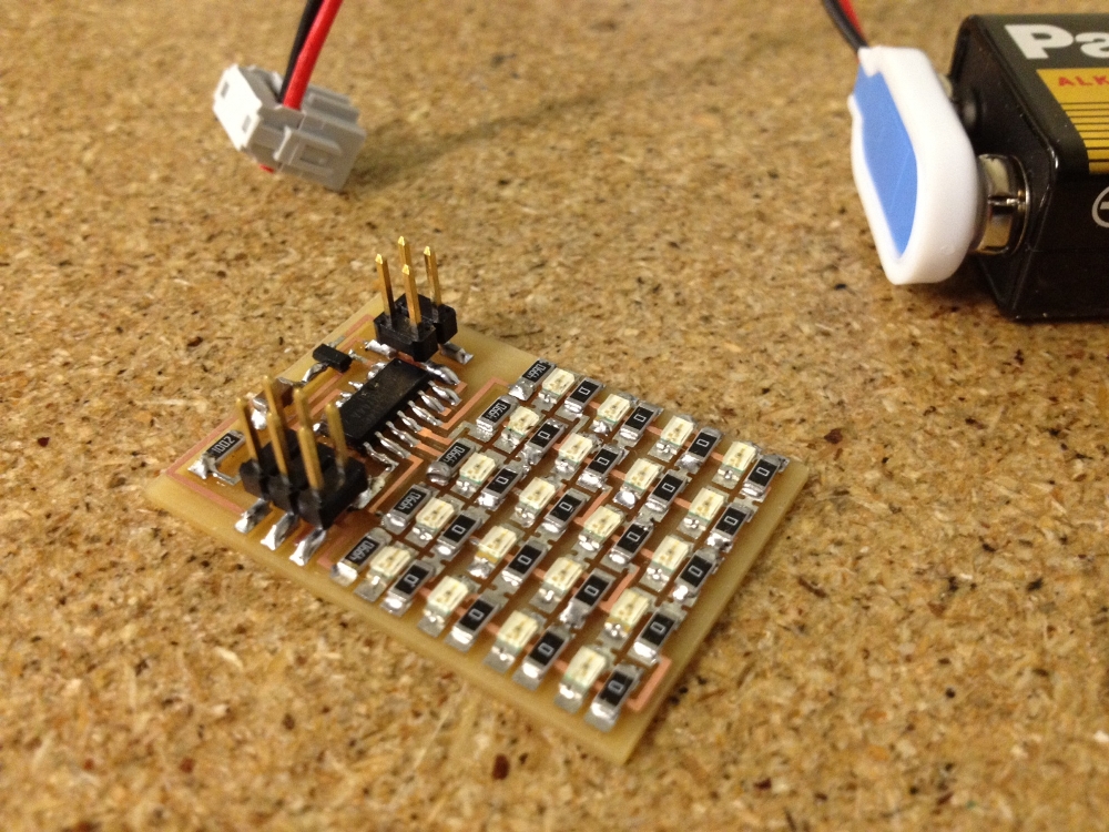 Stuffing this board took a little while - 90 solders for the LED's and Resistors. After an inefficient few rows, I set up an assembly line - flowing a dab of solder on every other pad in advance of component placement helped me get into a rhythm and I began moving much faster. Prior to programming, I used solder braid (very quickly so I wouldn't desolder any components) to wick up excess solder/any apparent mistakenly connected traces. I then connected the 4 pin header on the board to a 9v battery, and programmed the board with my FabISP by moving to the folder with the C and makefile in the terminal and running 'sudo make -f hello.array.44.make program-usbtiny'. Board lit right up and ran through the paces of Neil's code.