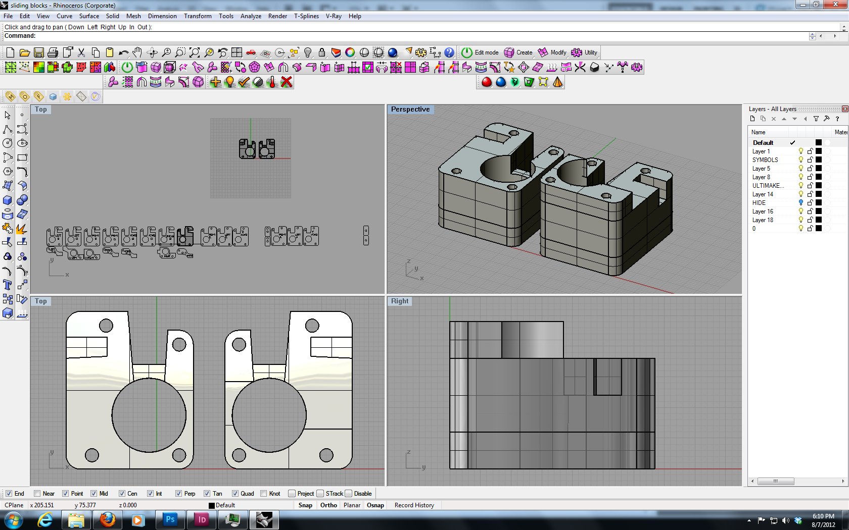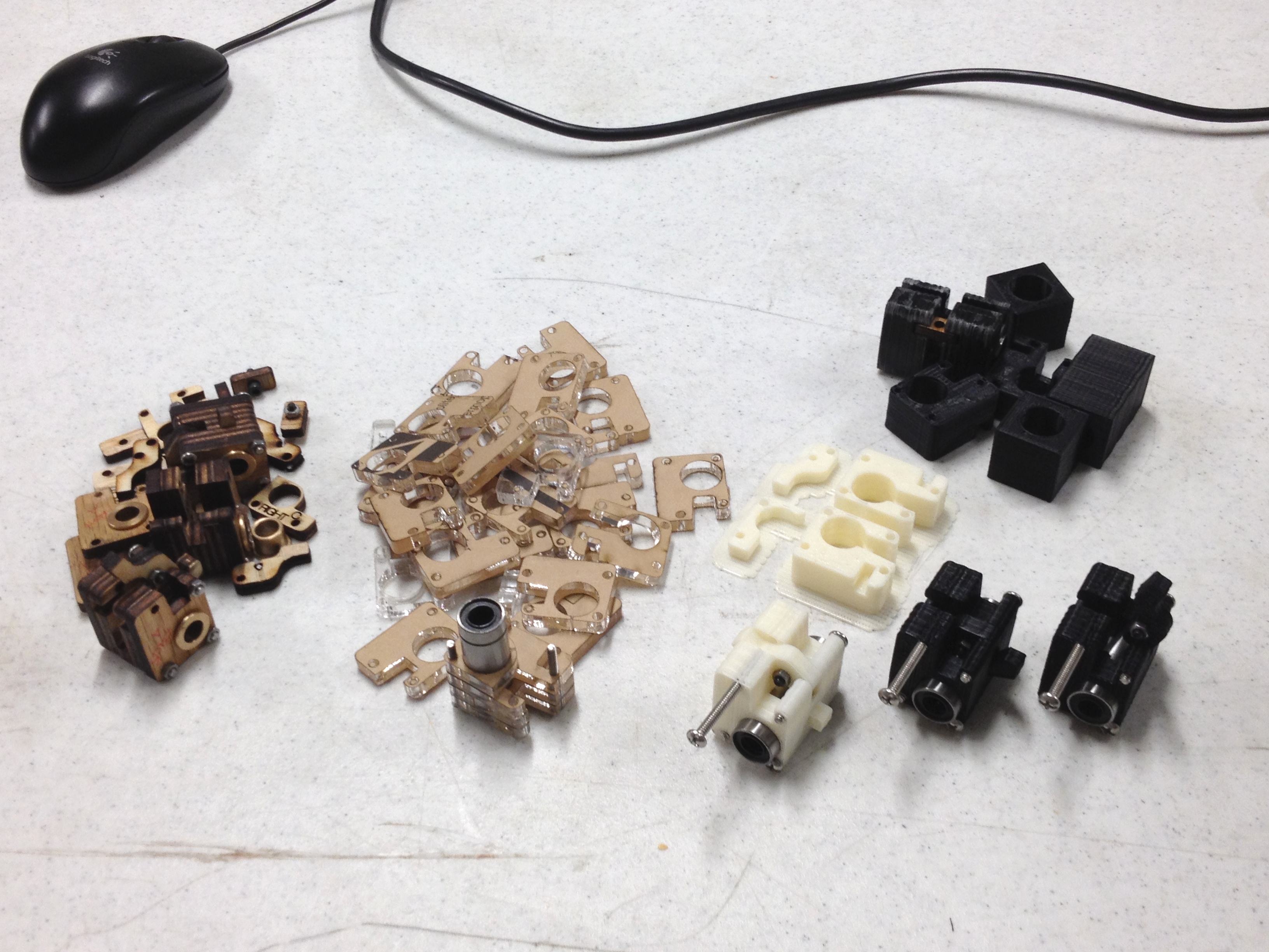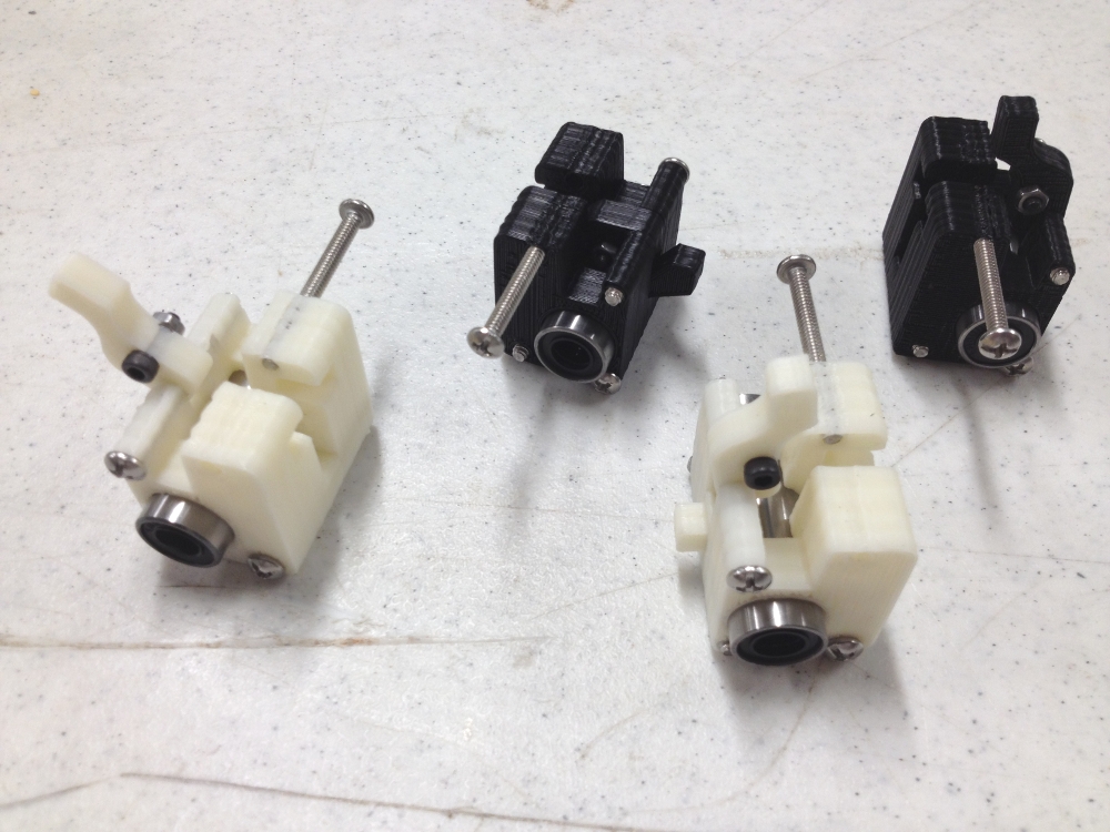 Outside pieces of sliding block assembly are the same - mirrored - with variations at the centers (little horns that engage kill switches when sliding blocks and extruder have gone too far). Basically, the 2 outside pieces of one side were extruded and combined, then mirrored. A longer sliding block meant longer screws but nuts were no longer needed as screws basically tapped the plastic holes.