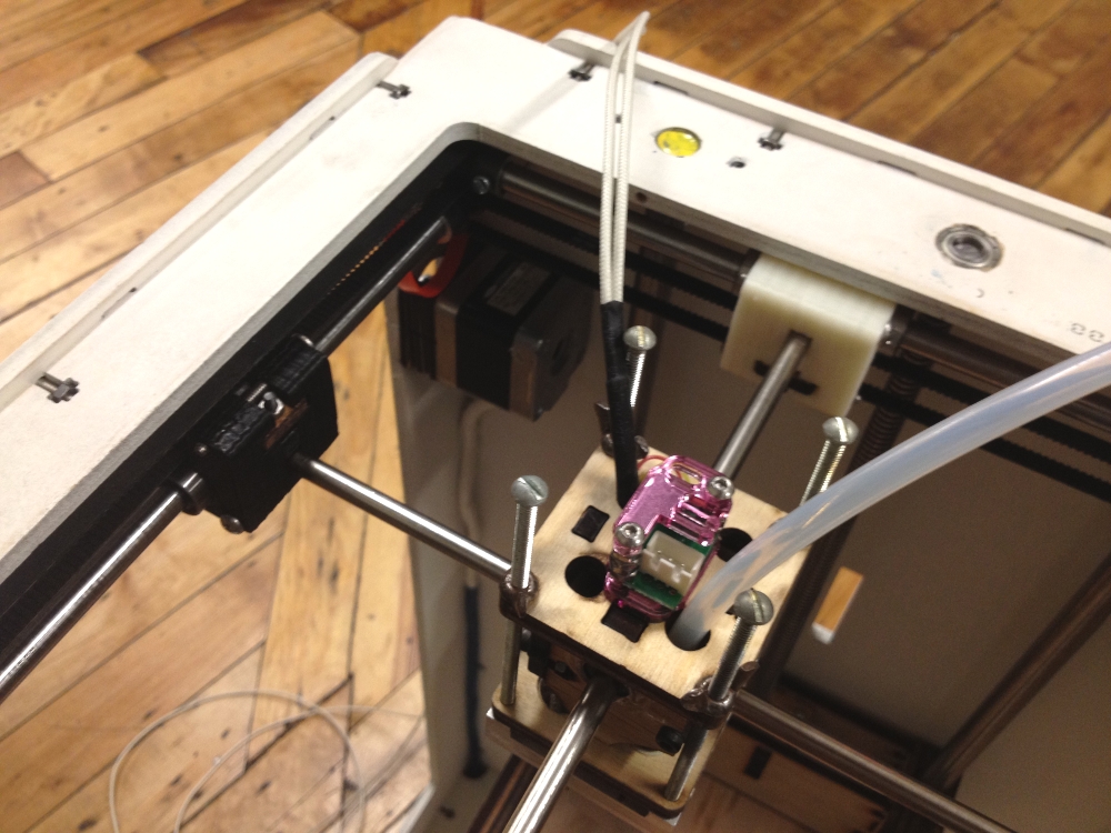 Cross bars (that the extruder moves on) are held in place by a lowered arm which is pinned tight by a piece of laser cut plywood. Extruder alignment is off so for the time-being makes sliding block movement on rods jumpy. We need to take another look at the extruder.
