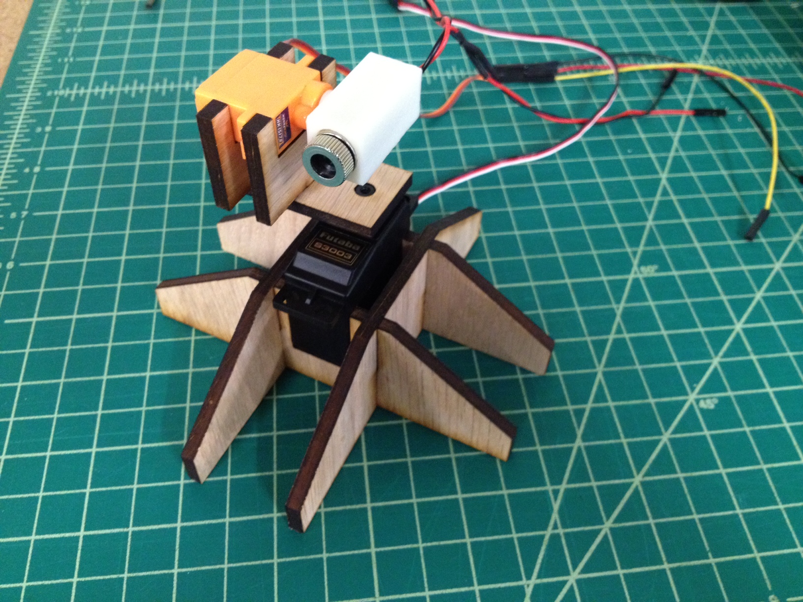Made a press-fit turret mount for the motor-controlled laser using the laser cutter and 3d printed the laser mount/servo horn - no glue needed, and really tight.