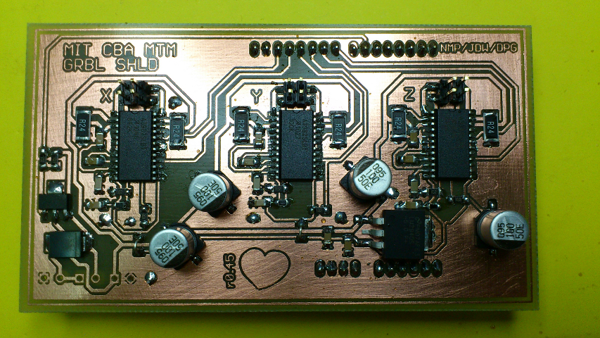 We are working on finishing our version of the mantis CNC, we are calling it Mantis X (last model was 9). The mantis uses a simple electronic control using the parallel port of the computer to drive the steppers from the linux EMC2 software. We wanted to use the fabmodules, so I made a version of the MTM board and modified the MTM GRBL version do adapt it for our threaded rods, sizes, and everything. For this project Raquel worked with the CAD design, and I with the electronics and software. Both of us worked in the machining and assembly of the final system.