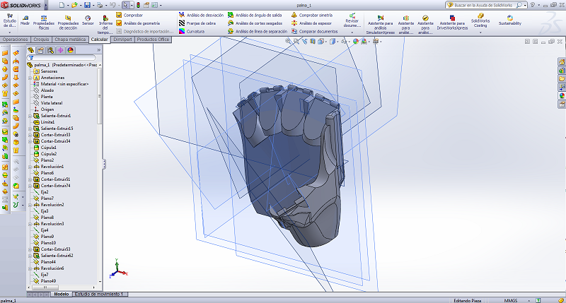 For this assignment I made a hand with SolidWorks, It was very hard to design because I do not know how will be the mechanism, so I was thinking for weeks and finally I found a way to design it, each piece of the fingers has a little hold to introduce a wire that will connect the servomotors with the fingertip.
