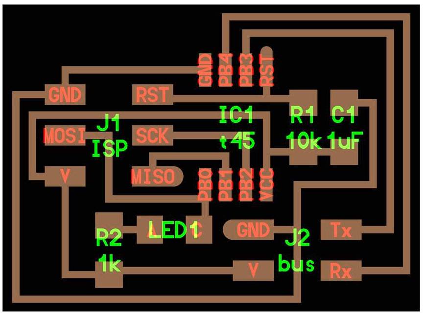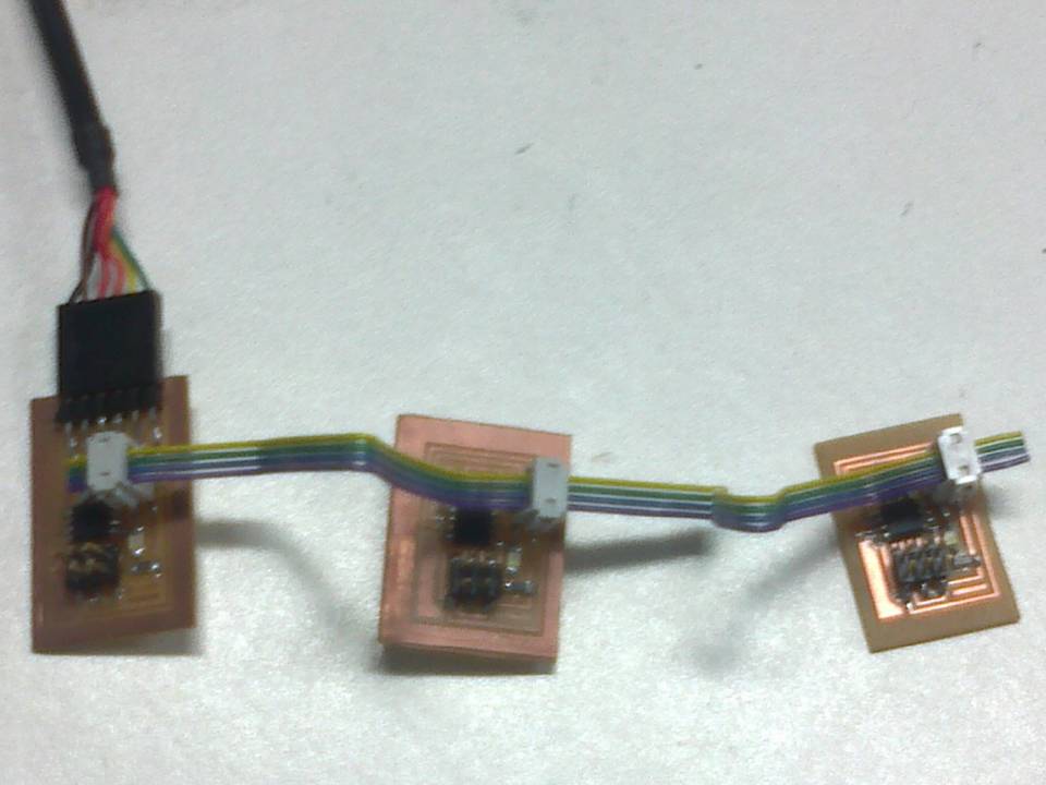 On the terminal: sudo make -f hello.bus.45.make program-usbtiny Then must appear hex file, and sudo avrdude -p t45 -P usb -c usbtiny -U flash:w:hello.bus.45.c.hex, for flashing the microcontroller We must make the same procedure for the node boards taking care to change the node numbers in the C file where the bridge will have the number zero (0) and the nodes will have the numbers (1) and (2) for each one .I followed the tutorial from Anna Kasiunas |