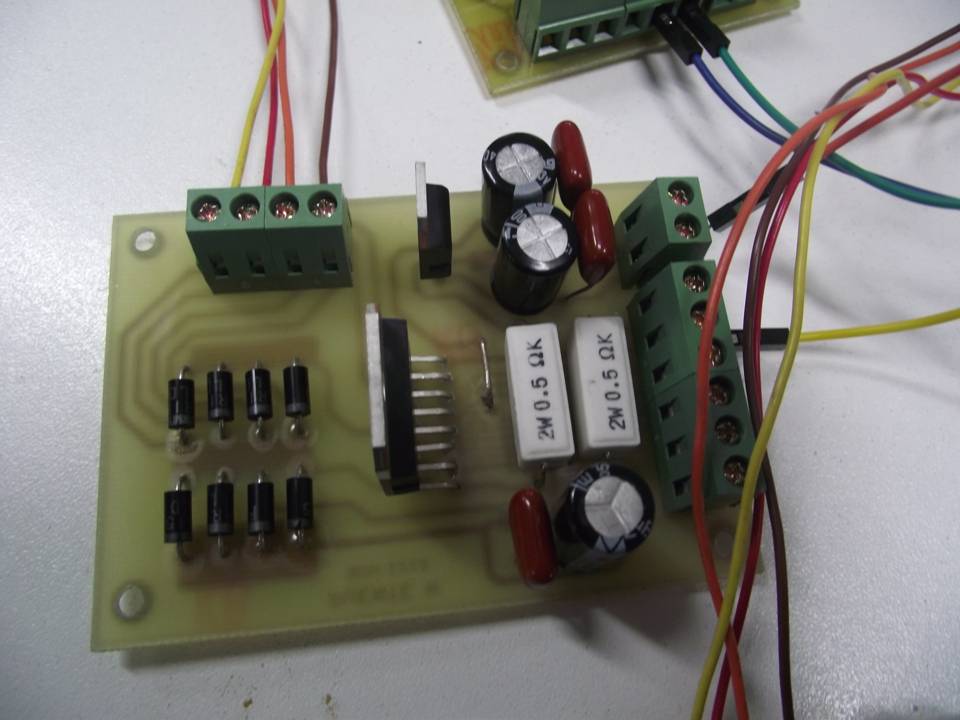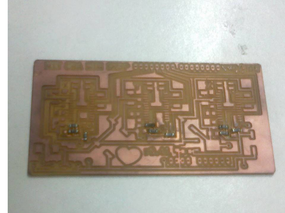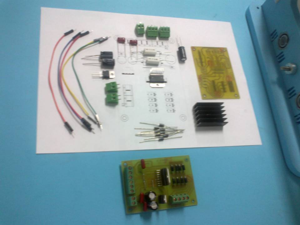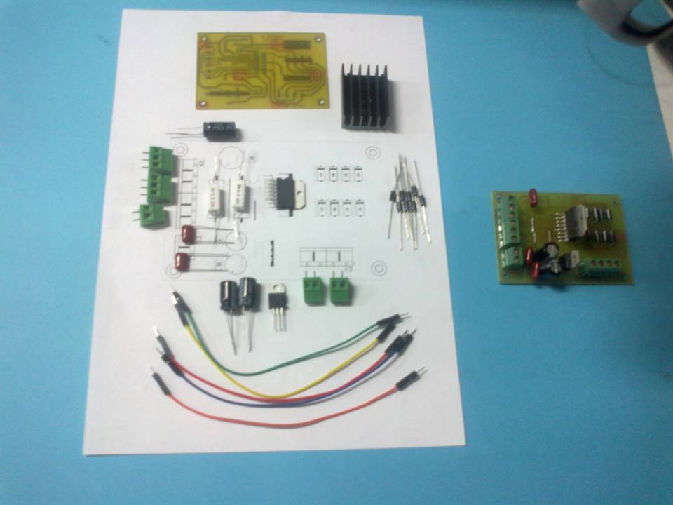| As you can see in the pictures, the components for the new designed board are a bit different and bigger than the original ones so we needed to use three, one for each motor. Below the components we show the board completly assembled |