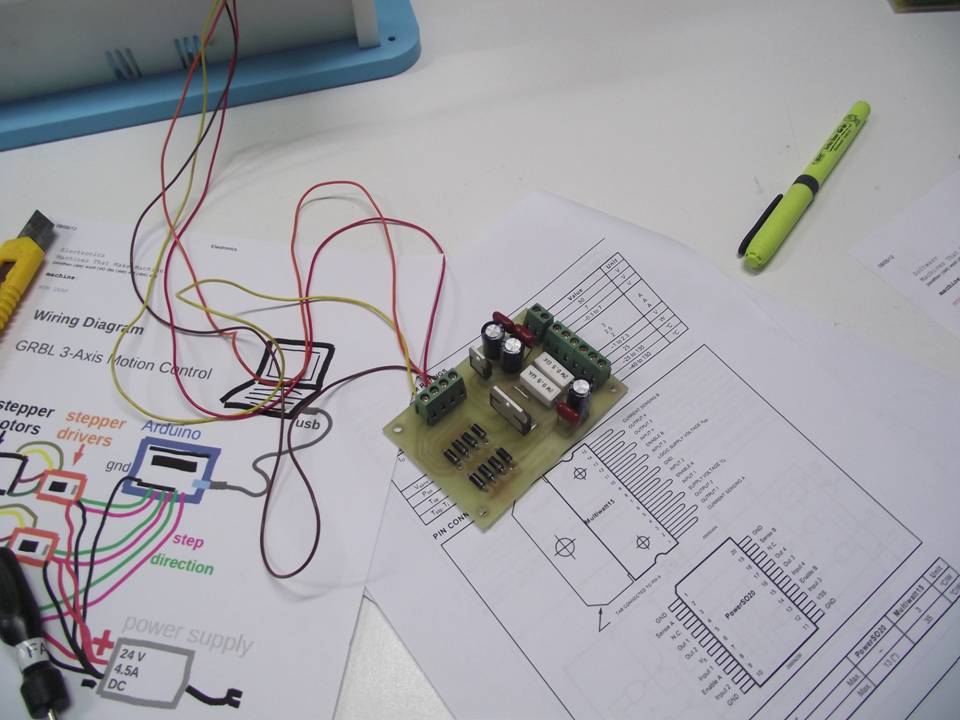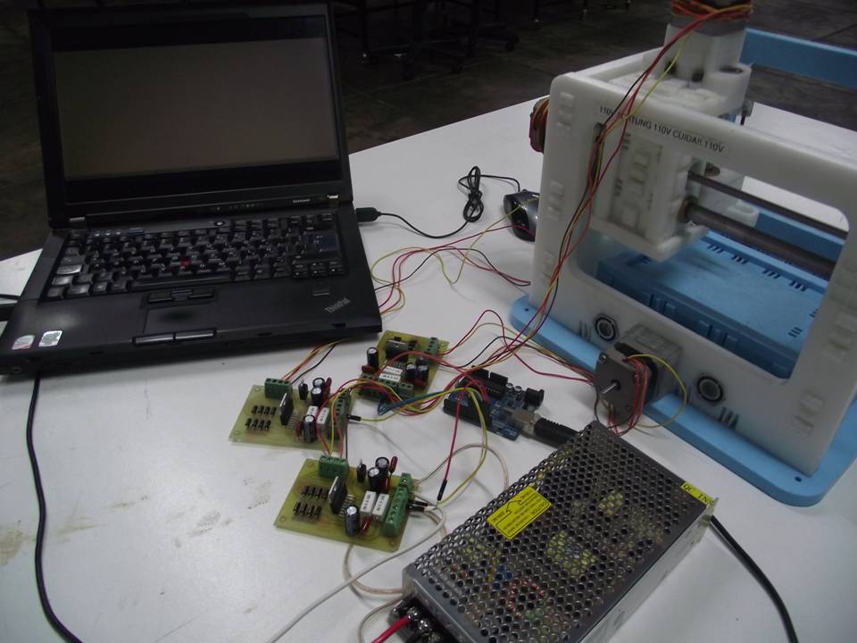 Now we are making the connections of each H bridge board to each stepper motor and test the Switching PS For complete the assembling we connect the Arduino to the notebook and to each board. We have the machine ready to be operated in automate mode. After installed the software, it was necesary to modify it for controlling the new boards. We had some problems in the connections of the boards with the Arduino UNO and we expect to solve them in the following days. By now the task is in progress. |