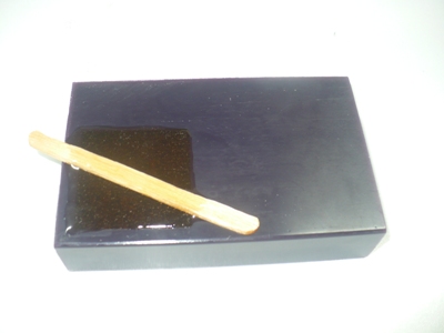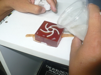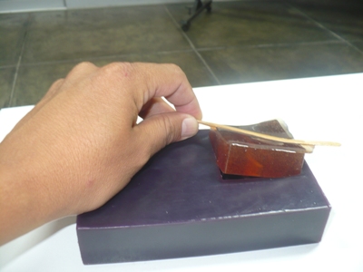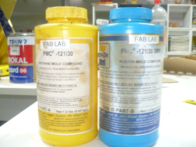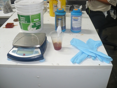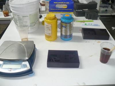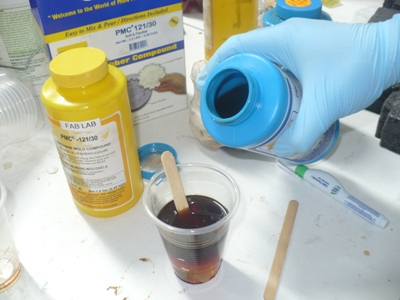 After mixing the 2 parts to prepare the molding resine we must mix the compounds in a 1:1 ratio of A: Urethane mold compound and B: Rubber mold compound. As you can see in the picture it is better if we leave a stick on the top for facilitate the demolding of the casted resine. By the way, it is necesary the use of gloves in all the process stages to avoid the direct contact of the compounds with the skin. It is also important to have the necesary elements at the hand around the work area and make the casting in a clean and order way