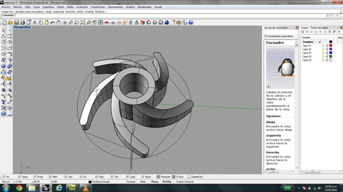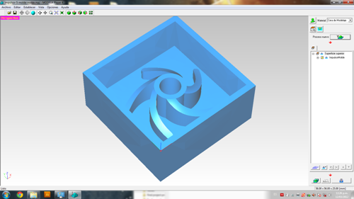 Once more the Rhino program was used to design the component to be produced, It was necesary to draw the complete box where the mold was going to be hosed in according with the tool diameter and taking care to leaving 3 mm bellow the top level of the wax. |