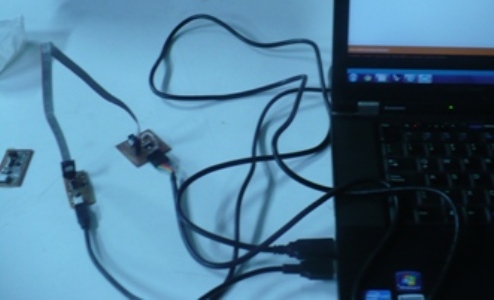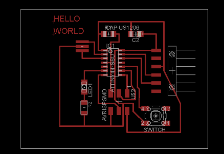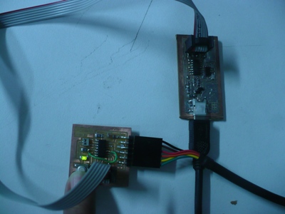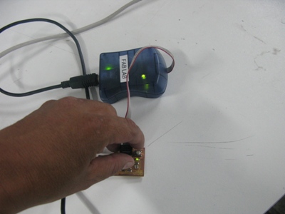 Make the connection between the fabISP programmer and the HELLO WORLD board with a ftdi wire, the miniUSB from the fabISP and the computer and finally the FTDI connector from the HELLO WORLD board and the computer