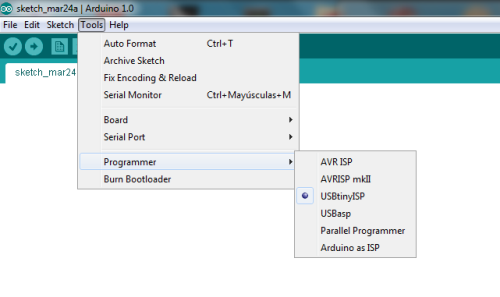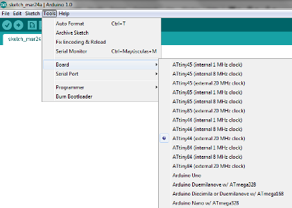 Once we had installed the Arduino we have to set: The "Attiny44 ( 20MHz )from the Menu "tool/board" The correct port from the Menu "tool/SerialPort" . Cheking device manager in "Ports Com" Select the "usbtiny from "Menu "tool/programmer" "Burn Bootloader" |