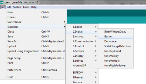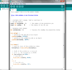 Finally, open the Button file from the examples menu and modify the ports' pins