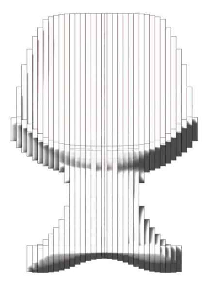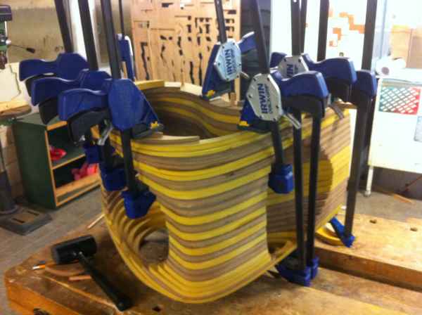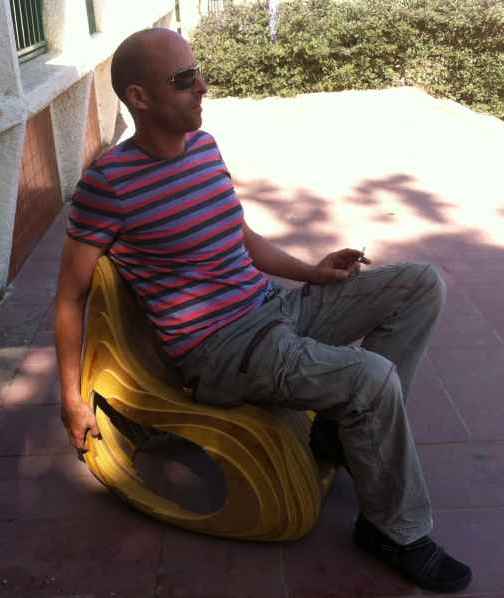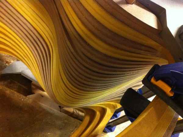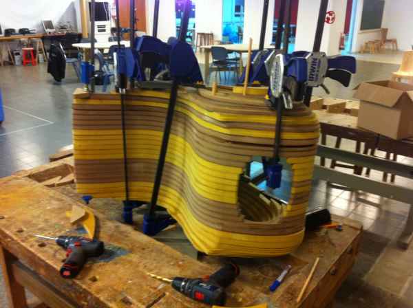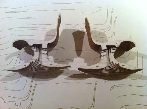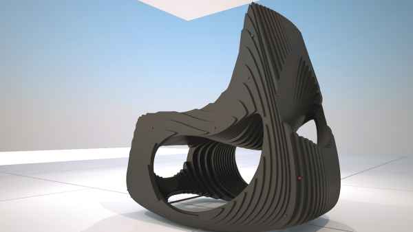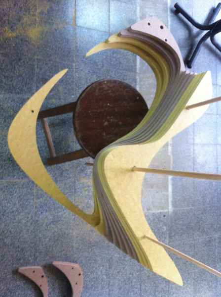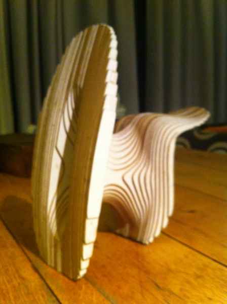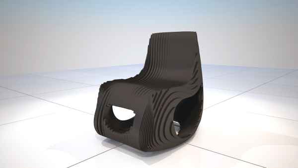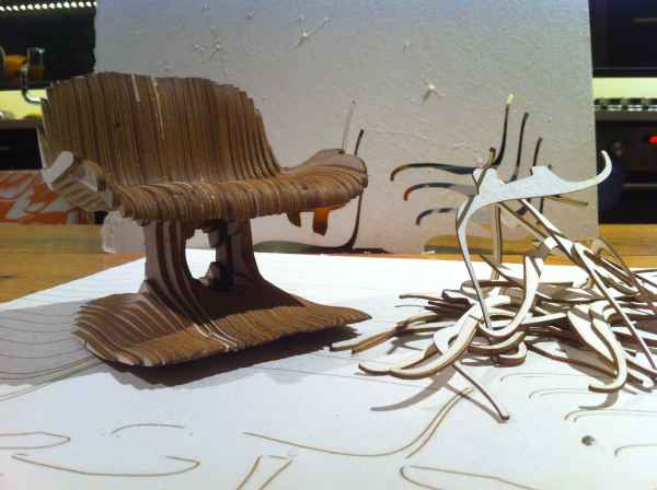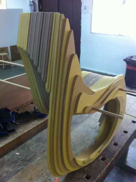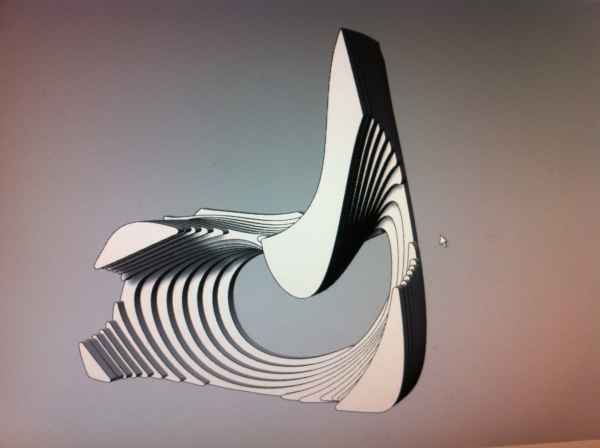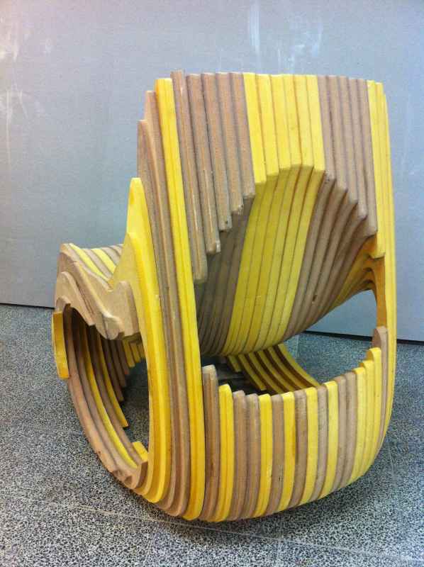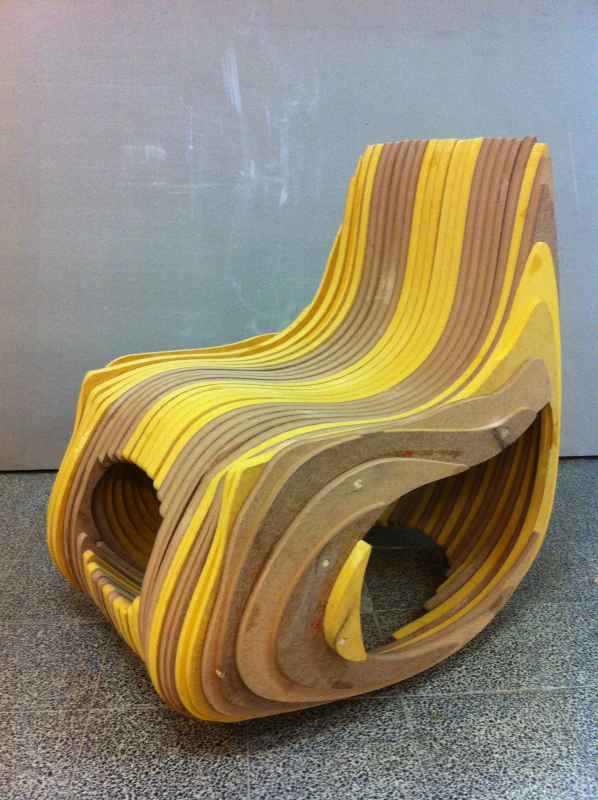 I cut the model in rhino using the contour command.I set the distance between each contour line as the thickness of the material that i am using. in this case i am usine a colored M.D.F. board, 19 millimeter width. after getting the contours, i extruded them to have a 3d model of the chair.