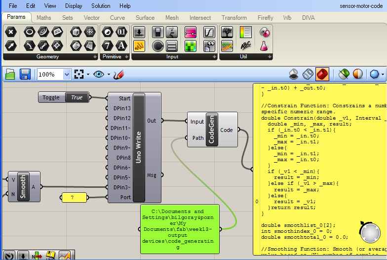 To the out pin of the “uno write” component i added a “code generator” component so the code can be generated to a specific location that i set in the path pin.