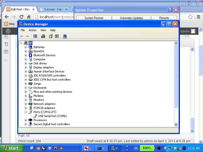 - connect the FDTI cabel and check the port number. right click on my computer,select properties ‘ select devices manager and see the number of the serial port- com6