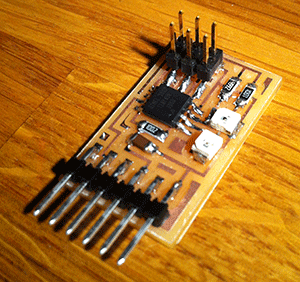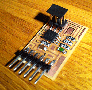 Input devices:This weeks assignment is to make an input device. My computer unfortunately gave up the ghost just before this class, so I had very little time to actually redesign a board. Instead I opted to just make one of Neil's example boards. I decided to make the Hello.Reflect board, so I downloaded the .PNG files and loaded them into the Fab Modules, and milled them out on the Modela. As I was soldering the parts on to the board, something wasn't right. It turned out that I actually milled out internals for the hello.temp board; I guess I got my files mixed up. I decided to go with it and just make that board, but I ended up also milling out the correct hello.reflect board. After milling and soldering the boards, I jumped into Terminal to load the boards up with the C code provided. I used the FTDI Programming tutorial provided in Embedded Programming to run through the commands. I got an error when I tried to flash the fuses, as I didn't realise that there weren't any external crystals and I could skip that step.