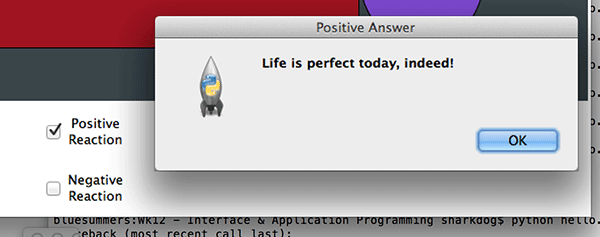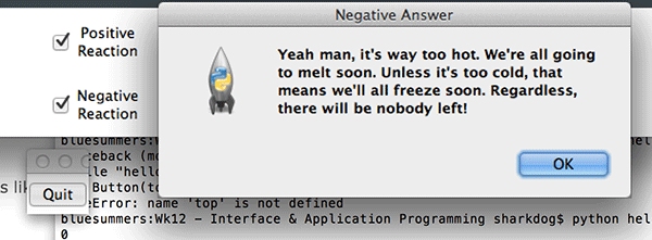 Checking and unchecking the boxes is fun, but I wanted something to happen. Luckily, I figured out you can add a 'command' to the checkbox that is executed as you click on it. I combined the command with another one called tkMessageBox, which pops up a small dialog with some text.