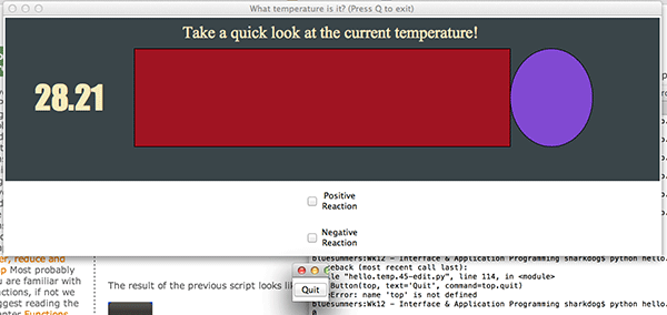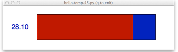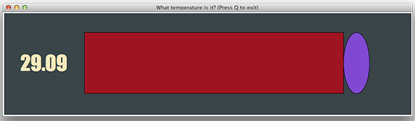 Most of the changes I then made were applied to the Canvas, as I understood that that was the window being drawn. root.title('hello.temp.45.py (q to exit)')root.title('What temperature is it? (Press Q to exit)')In the canvas I then found a line creating a rectangle. On the effbot resource page I found that you could also use different geometric shapes. I decided to change the blue bar to an ellipse, and keep the red bar as red. This basically has the red bar squishing a blue ball as the temperature rises.