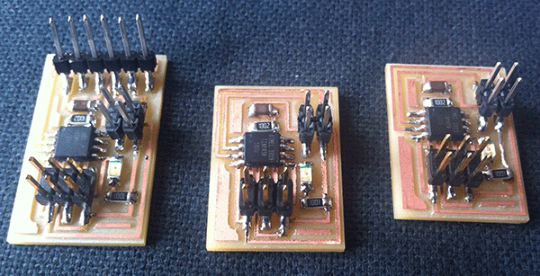 Having produced the boards (and having numbered the nodes 1 and 2 with some tape), it was time to program them. I connected each board to a computer through the FabISP, and loaded the provided code onto them. Going back to the code, there was one easy bit to change. #define node_id '0