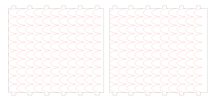 I wasn't the first one to do my test cut, so thanks to Maurice op de Beek we figured out that the laser takes about 0.1 mm of material off of the edge. For the indentations that would mean that 3 mm (the thickness of the MDF) would become 3.2 mm. This would make the designs very loose, and unable to fit together properly. To compensate, I adjusted the width of the indentations to 2.8 mm. This is where a parametric design would've probably been helpful, but it wasn't that cumbersome to adjust in Illustrator.