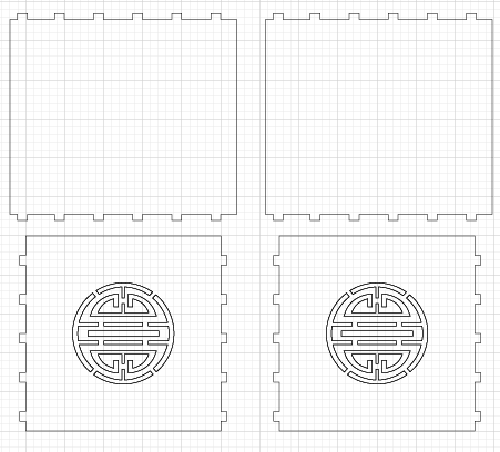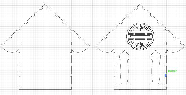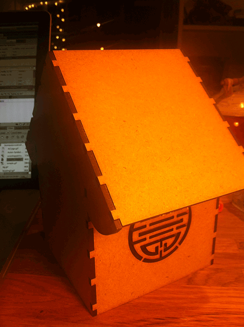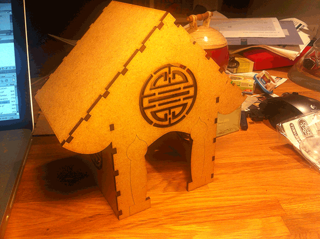 I started designing, and ended up with a little house that looked a little like a temple. I incorporated the asian pattern that I also used on the vinylcutter, to be laser cut out from the sides of the walls. I also added two 'columns' to the design, on the sides of the 'entrance', to be engraved into the wood.