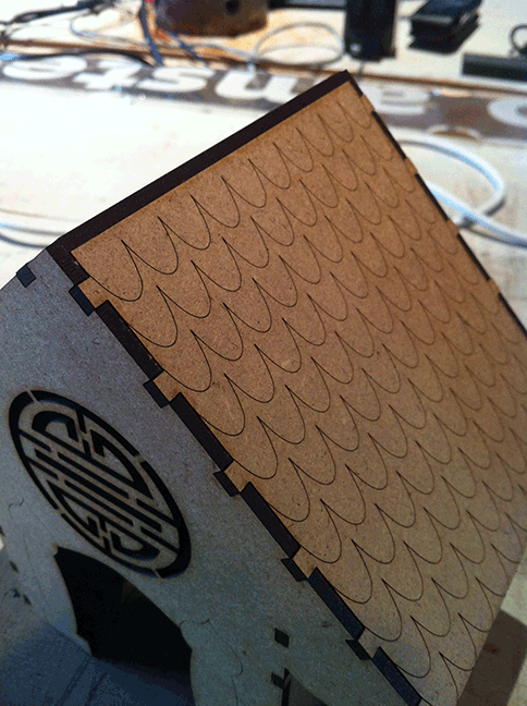 Here is the final version of my little temple (fellow students have dubbed it the 'doghouse' though). As you can see, the rooftiles don't overlap anymore, and they fit snugly. Since I was working on the roof tiles anyway, I figured I'd add some shingles to them with an engraving. The engravings were also created in photoshop, a simple stroked path copied to fit over the entire roof. Here's the design for the roof: