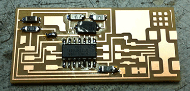 We started out by loading up the hello.ISP.44.cad file (found here) into the Fab Modules, and selecting the traces to be sent to the small milling machine. Our guru went through the settings and had us up and running fairly quickly. We loaded up one of the copper coated plates into the Modela and we used the Fab Modules to send the print. The Modela went on its merry little way, and a few minutes later we had our first milled PCB, which I quickly appropriated for myself.