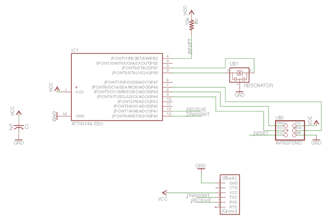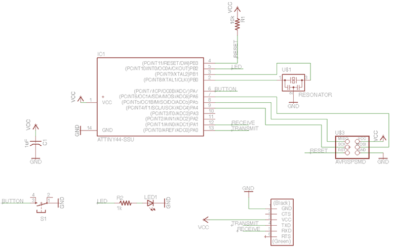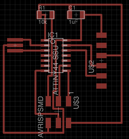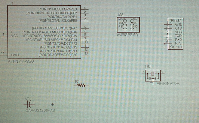 Technically, I was ready to export the board and have the Modela mill it out for me. However, I saw two vast empty spaces staring back at me from the board layout. One on the top left, and one on the top right. Seeing that there were still a few connectors left on the right side of the Tiny44 chip, I decided to be daring and add another LED to the mix. In the schematic, I basically copied the component that consisted of a resistor and an LED and connected it with one of the free connectors on the Tiny44. I wasn't sure what to do with the open space at the top left, but I soon had an idea that you'll see if you read further on.