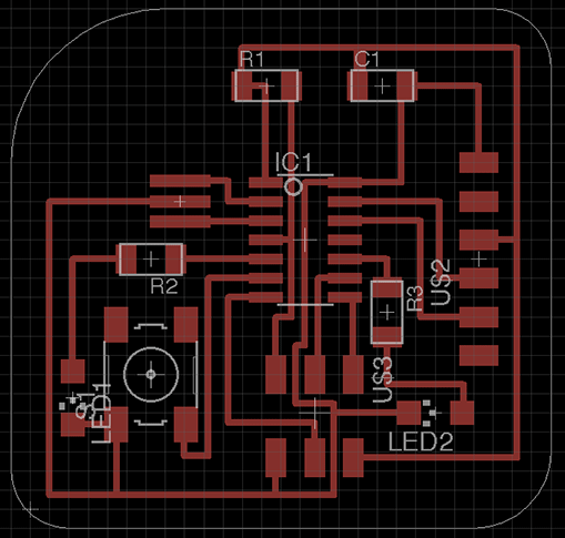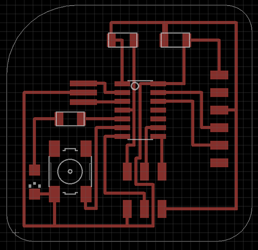 But we're not done yet! This is only the design of the original PCB that was supplied, but we still need to modify it. As per the assignment, we need to add an LED and a switch into the mix. This meant adding three components. The switch, an LED and a resistor for the LED. We went back to the schematic and added these components. There were still plenty of spots free on the Tiny44 processor, so we chose two (which were on the same side, we double checked this in the board layout) and connected the wires. From there we again jump into the board layout and the added components were there. They still needed to be placed into the layout and connected though. Luckily, there was a perfect large area within the design on the left, so I ended up adding them there (though I did extend the open area a little to fit it all in). Here I also added the line around the board design, which will indicate how the modela will end up cutting out the board outline to seperate it from the plate. I decided to get a little fancy here and add some rounded edges to it.