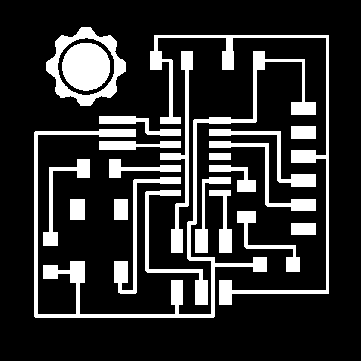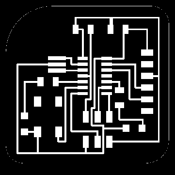 From Eagle, I exported the board as a monochrome image. In the settings you can set the DPI you'd like to save it as. This will give you a nice and clean .PNG file to work from. There's still an extra step before you're ready to send it off to the Modela, so I booted up Photoshop to create the interior and exterior images that I'd need. The exterior is just the outline of the board with the entire inside filled in with white. This we'll use to cut out the board so we can take it off the plate. The interior is the entire design sans outline, so the Modela can mill all the paths neatly. Since I was in Photoshop, I sneakily added a custom logo to the board, to add some personal flair to the board, so I could instantly recognize it in a crowd.