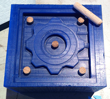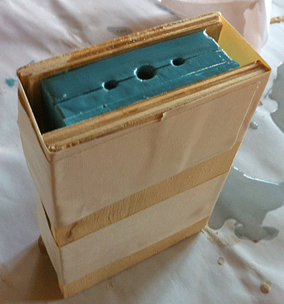 Since I'm using the one wax mold for both sides of this casting mold, I then inserted wooden pegs into the holes on the wax mold, and poured on another layer of Oomoo.