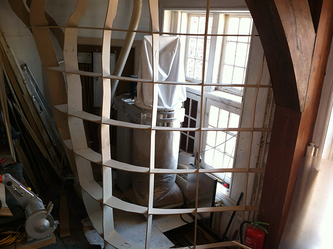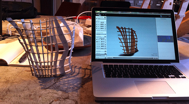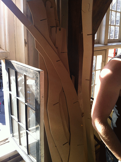 Computer-Controlled Machining.This weeks assignment was to make something big. In order to do this, we actually decided to turn it into a group project. The lab in Amsterdam has a ShopBot milling machine. Attached to this is a large ShopVac dustcollector/filter. The problem here is that it makes a lot of noise. It was suggested to us by Alex Schaub (who runs the lab) to create an enclosure for the ShopVac. So we set off to do just that! We started out by taking measurements of the ShopVac and the area around it. We wanted to make it fit without needing too many attachment points so we needed a tight fit. In Rhino I then plugged in the measurements to create a representation of the room. From there, I drew a curve on the layout along the shape that we had in mind. I decided to try and make an interesting organic looking wall, which was kind of wavy. ![]() After tweaking this model a little more, I wanted to make our first mockup. In order to do this, I exported the file from Rhino to 123D Make. 123D Make is a fairly easy to use application that can automatically generate a sliced up version of a 3D model, complete with slits to fit the entire structure together. I scaled down the size so we could quickly create the mockup and moved on over to the laser cutter to cut it out of cardboard. ![]() Looks pretty promising! After tweaking the model a little more in Rhino, to also accomodate the beams running over the ceiling and to improve the overall flow. At somepoint the workflow had to be changed because the extruded wall was intersecting with itself. Originaly I had just drawn a number of curves in Rhino on top of eachother and used the Loft tool to create a surface between those. When extruding this Loft surface it caused intersecting problems, so we ended up redrawing most of the curves, adding an extra curve behind every curve to simulate the thickness of the wall. After creating another mockup and approving our design, we wanted to create the fullsized version of our structure, but as with any project we ran into a few snags. The size of the wall was taller than the largest plates that the ShopBot could mill. The solution was to split certain slices into two and adding jigsaw like joints to them before laying them out on cut-sheets. Another problem we ran into was a scaling issue. Even though all the settings were set correctly for millimetres, somehow the file exported from 123D Make would not retain the correct dimensions. Soon after I discovered that 123D Make actually kept to inches, even though everything was set to millimetres. From there I could easily re-scale the project and make it fit. After exporting the files from 123D Make, we took the 2D images of the vertices and were all set to add the jigsaw joints to them. Unfortunately, we ran into another problem here. Our trusty 2D editing programs (like Illustrator and Inkscape) could not handle the file that 123D Make put out. The issue here was the size of the structure, being over three metres tall, was a size that was way beyond the maximum workspace in these applications. We actually ended up importing the files back into Rhino again to split the slices and add jigsaw joints (the jigsaw points were added by Mio Kato). Then we opened the files in 3DS Max to do a final layout on the sheets we'd use to drive the ShopBot (this was done by Michael Hviid Nielsen). The material we used is 9mm MDF. It's a material the ShopBot can easily mill through, but just in case we set it to cut everything out into a few passes. After laying everything out within the size constraints of the sheets, we ended up needing six sheets (244cmx122cm each) to mill out our structure. ![]() I started plugging this information (one sheet at a time) into PartWorks to create a toolpath for the ShopBot. I also filleted all the notches with a T-Bone Fillet on the ends. This makes for an easier fit as it creates a small airpocket that won't resist at the end of a notch. Within a few hours we had all our pieces cut out and stacked against the wall. The cut out pieces have some slight jagged edges to the curve. I believe this is due to the way 123D Make creates a skeletal structure of the 3D object you load into it. You could probably spend more time refining the curves on the cut sheets after you export them from 123D Make, but there was no time to do this. Now there was still a task left to do. Put it together! ![]() Easier said than done. First of all, most of the notches still turned out to be too tight to fit together, so we filed them out until there was an easy bit still snug fit. We also discovered that on their own, the jigsaw connections weren't very strong and could easily break. After fitting a few pieces together and the structure becomes more rigid, this became less of a problem. Having basically put the structure together entirely, there's still a few bits here and there that need to be aligned, but that will take some old fashioned handiwork. ![]() Of course, there's more work to do! The structure is full of holes, and these will need to be closed up. We're currently thinking of using some sort of composite, and are eagerly awaiting the lecture on composites. We also need to add a door to the structure, so that the filterbag can be easily accessed and removed when needed. |