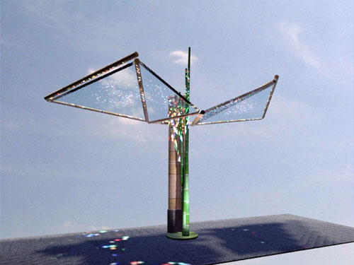The "wings" of my bamboo bird will move according to the sun movement and the different hours: morning, afternoon. At night it would be a spectacule of lights that are going to come out from the birds. Each bird will be connected to the othe one, to create various scenarios of light and movement. The structure is made of two bamboo rods of 10 cms that will support the bird from the ground.. The structure of the wings will be made of canes, wich is similar to bamboo, but lighter so it can be lifted by a motor. In the center I've designed a bamboo garden, so that the leaves will grow and mimic the tail of the bird.