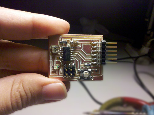 Recomendation: Use a different shape of mill and make more tests. I made 4 attempts until I finally got a board that I could use. What I can get out of this experience is that I learned how to use the Modela and making my own boards, which I believe was the purpose of this assignment. What I can see for the future is that I want to keep exploring the options of the Attiny microcontroller to incorporate it on my final project, since I want to use led and lightning sensors.
