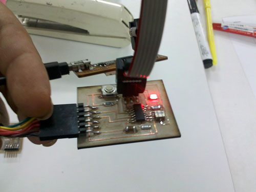 First problem I had here was to mill the board. I'm still trying to get familiar with the Modela, but I'll keep trying to get it better. Thanks to the help of Ricardo, I finally made a board I could use. The Hello Echo Board I used on my previous assignment didn't connect properly and I decided to made another one. Also, my FabIsp was not working, I had to make another one too. So, finally, after many tries, I did it. Also got through the programming.