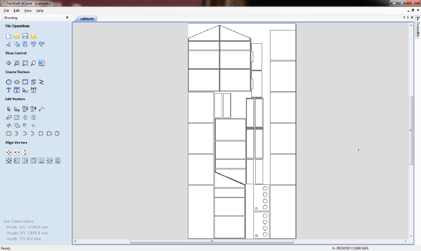 I have now placed each component on a template that is 2440 x 1220 mm, as shown above, I have access to an older version of this software away from the maklab but this only allows me to go so far as I do not know what cutters they have. I could assume a certain size of cutter but if I get this wrong I would just need to redo the work.
