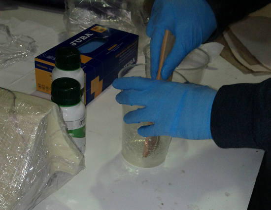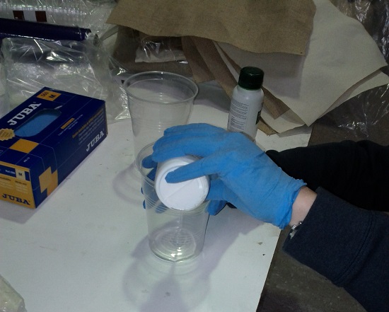 There which spreads the fabric pieces with epoxy resin mixed with a hardener. You have to pour 2 Parts Resin + 1 Part Hardener