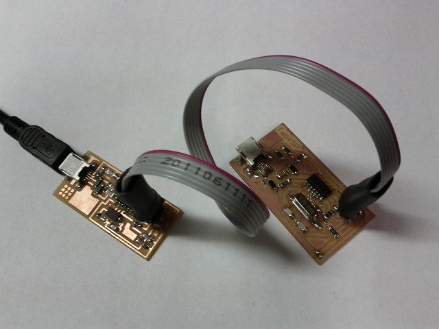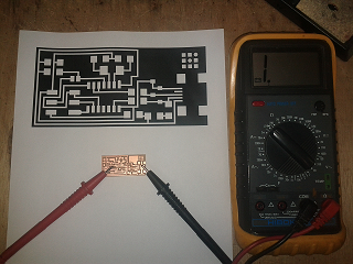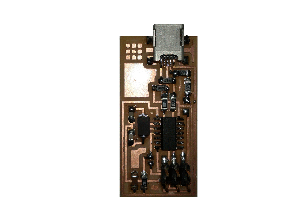 This week we have fabricated the first PCB board. The FabIsp programmer to AVR microcontrollers . A simple circuit formed by ATTINY44 with a 20MHz crystal, a mini USB connector, 6-pin ISP connector and several passive components.